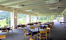 60名までおくつろぎいただけるレストランです。季節に合った豊富なメニューをご用意して、お待ちしております。窓の向こうにゆったりと広がるコースを眺めながらおくつろぎください。